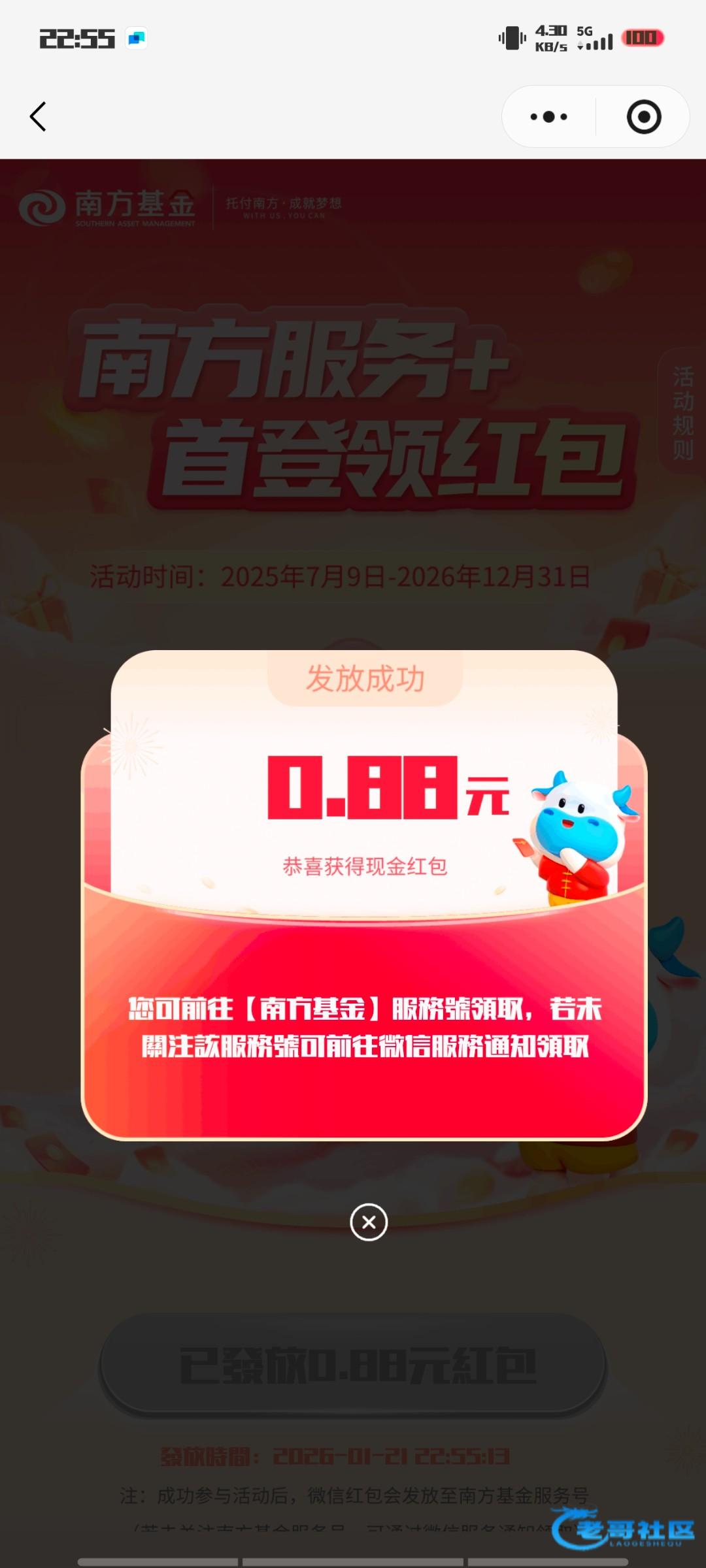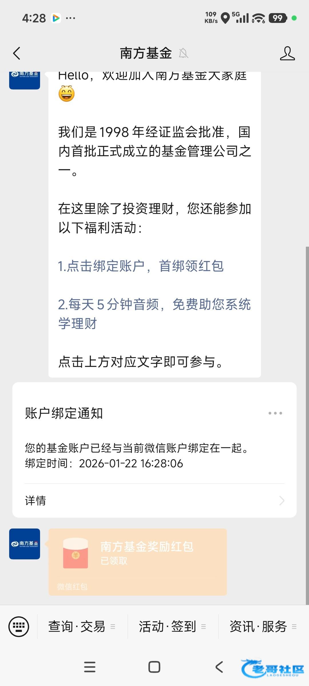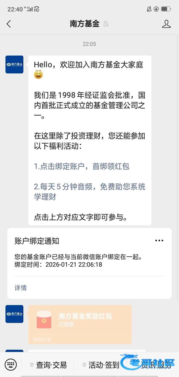 微信搜索南方基金公众号关注,点击绑定账户,首绑领红包,人脸登录,人人4元,没有基金账户也可以绑定