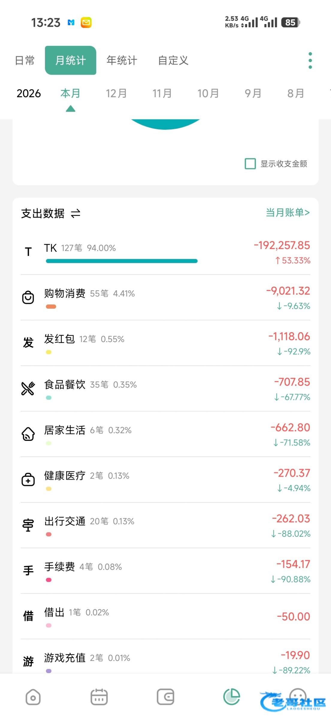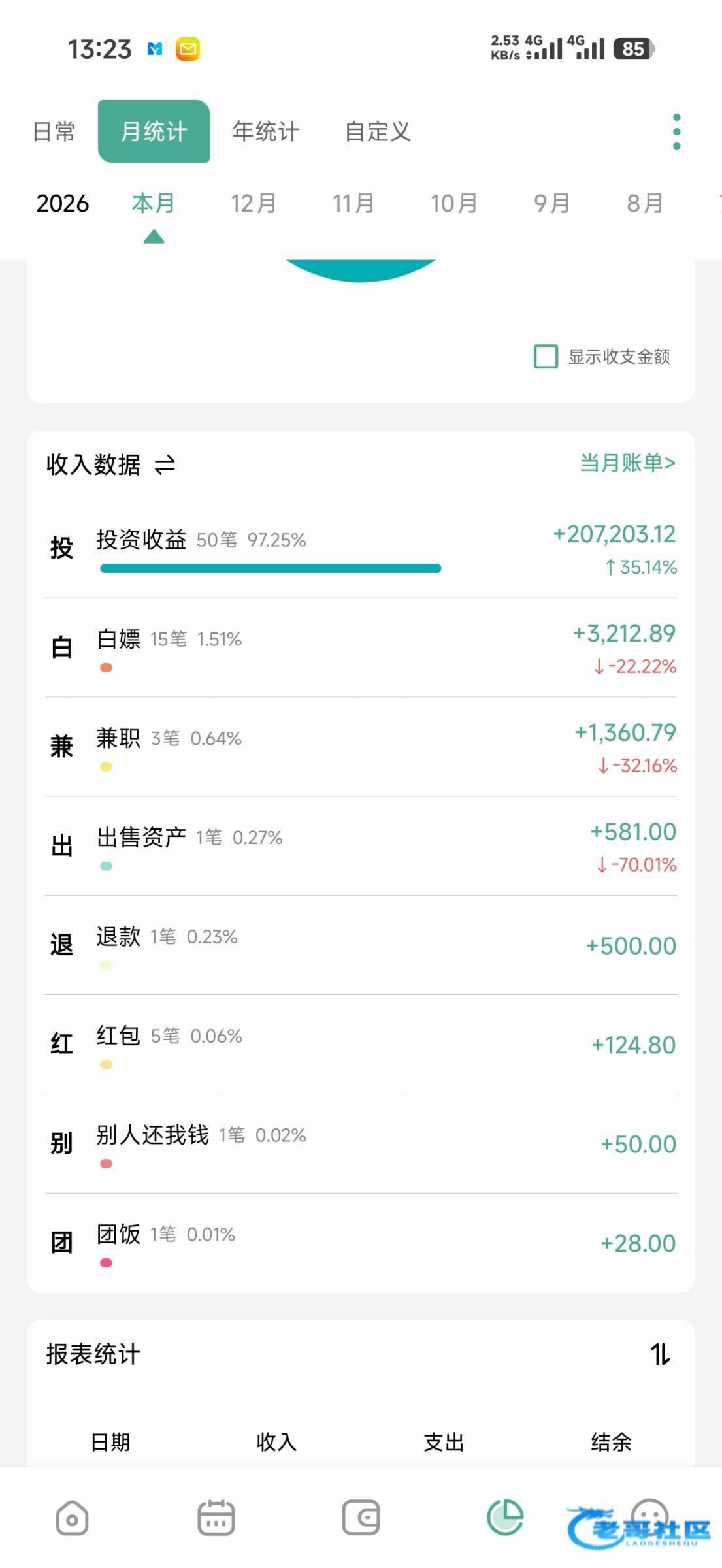 这个月赌博收入+207,203.12+3,212.89-192,257.85=18158.16 这个月14号那天输了36500,不然这个月赚五万了,就不能倍投,慢慢赢。这个月虽然赢了18000但是我现在余额只有8536,感觉也没有消费什么,就没有钱了。
