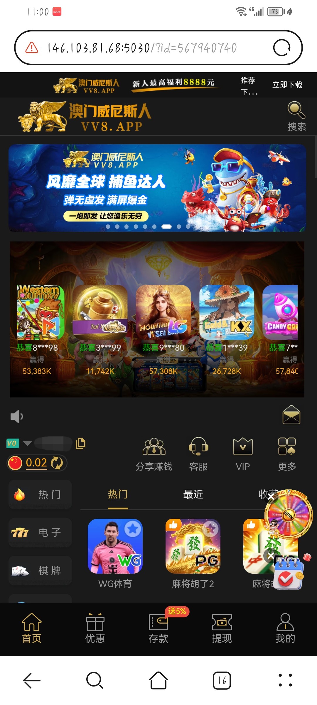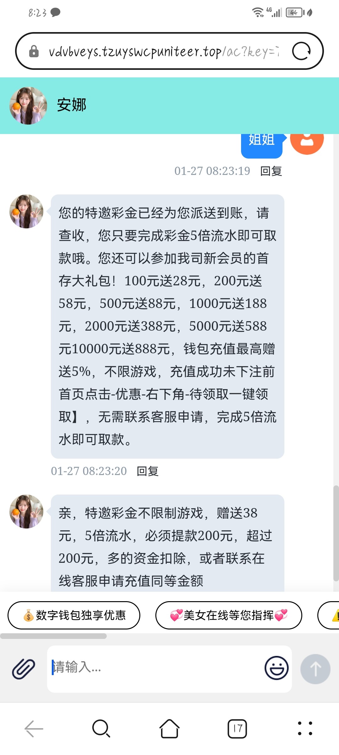 给我发了三次短信刚才拿短信图片去问客服就让我注册 报手机号码之后就给了 给了38 要打5倍流水 只能提现200 或者可以充值同等 不限制游戏 我打没了 去碰瓷白嫖即可 不要先注册可以先去看看自己号码符不符合 符合客服会让你注册账号 直接给你彩金 白嫖就好 充值风险自理 链接VV8.APP
