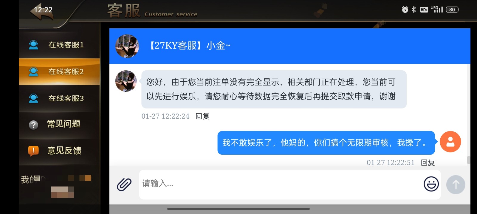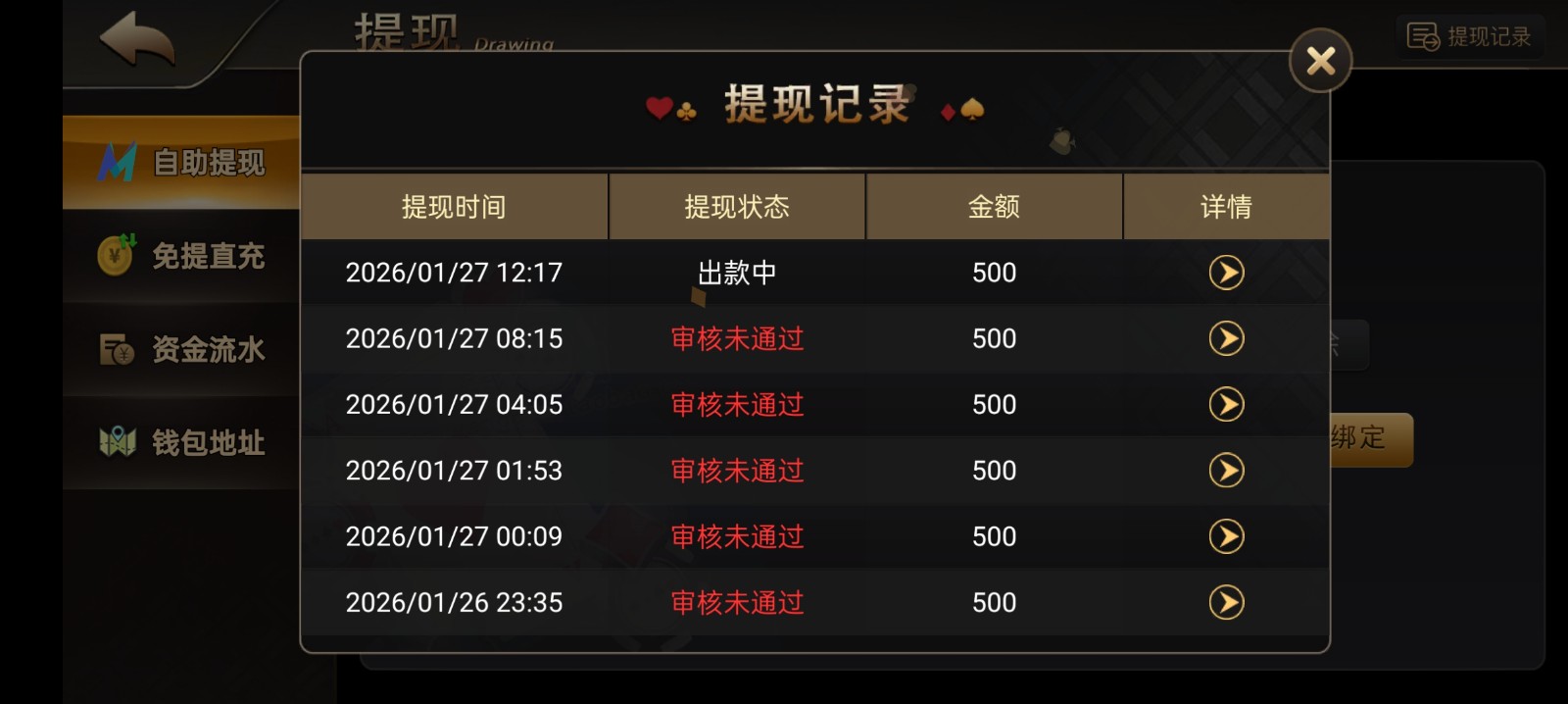 26号凌晨1点半还提现了300块钱,两三分钟到账,然后回充200块钱。提现了1000块钱,一直是这样子卡。退回了40多次。看到了我老哥网。有人说输到一定的金额可以出款,我现在输到500了,还是无限期审核。已经卡了30多个小时了。