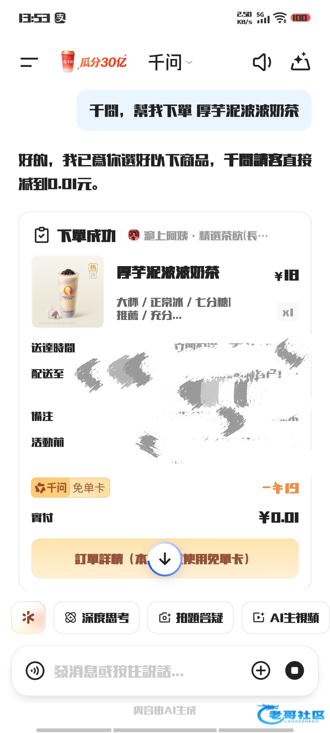 千问app对话框输入“帮我点杯奶茶” 给我点一个淘宝闪购的外卖免费门槛25内