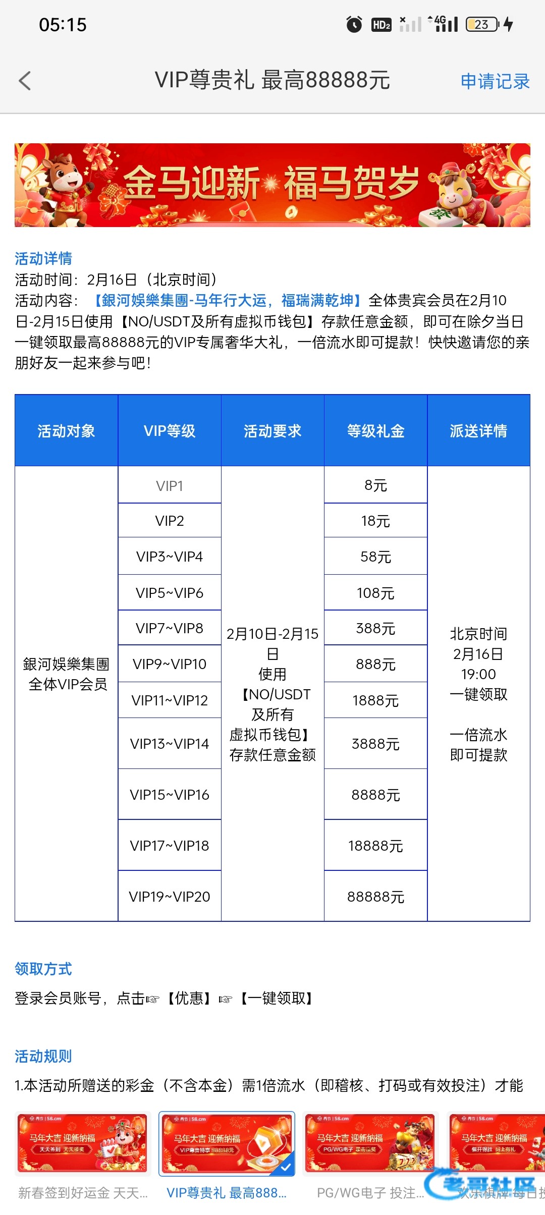 官网58.cm 15号之前充值10块钱可以领等级礼金,然后有会员等级的9天没充值过有流水娱乐过提现的也可以充值十块钱打两赔流水可以申请vip回归彩金
