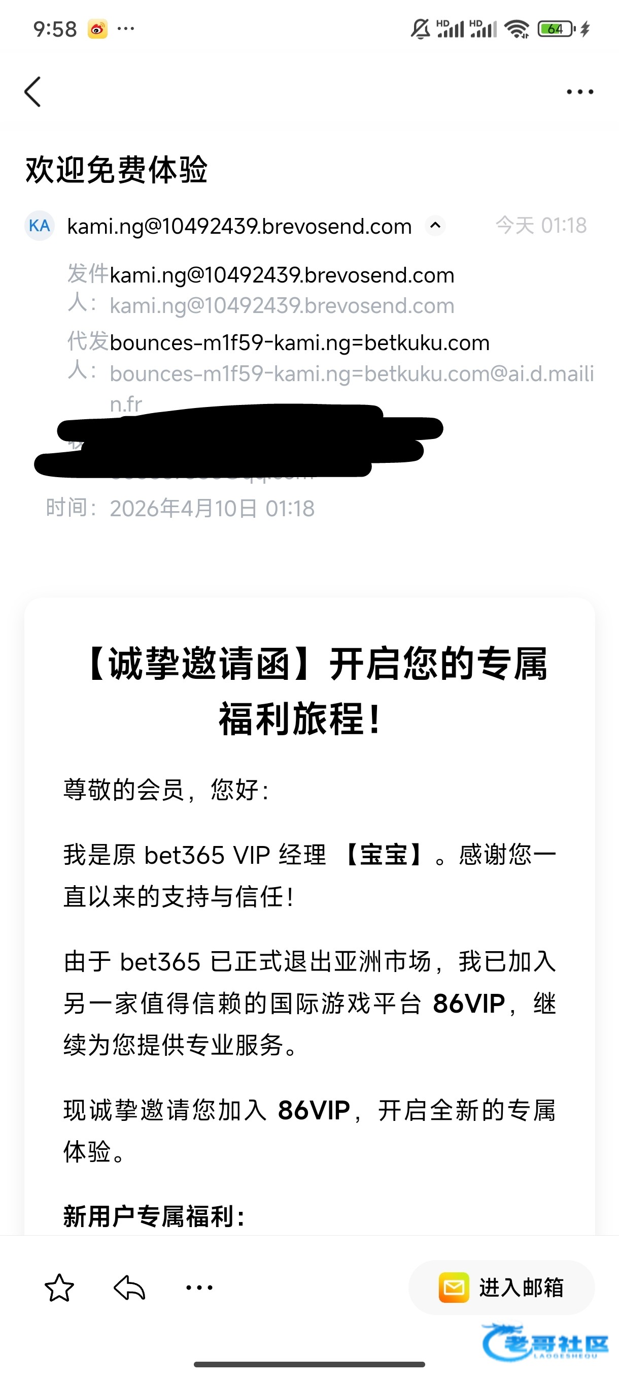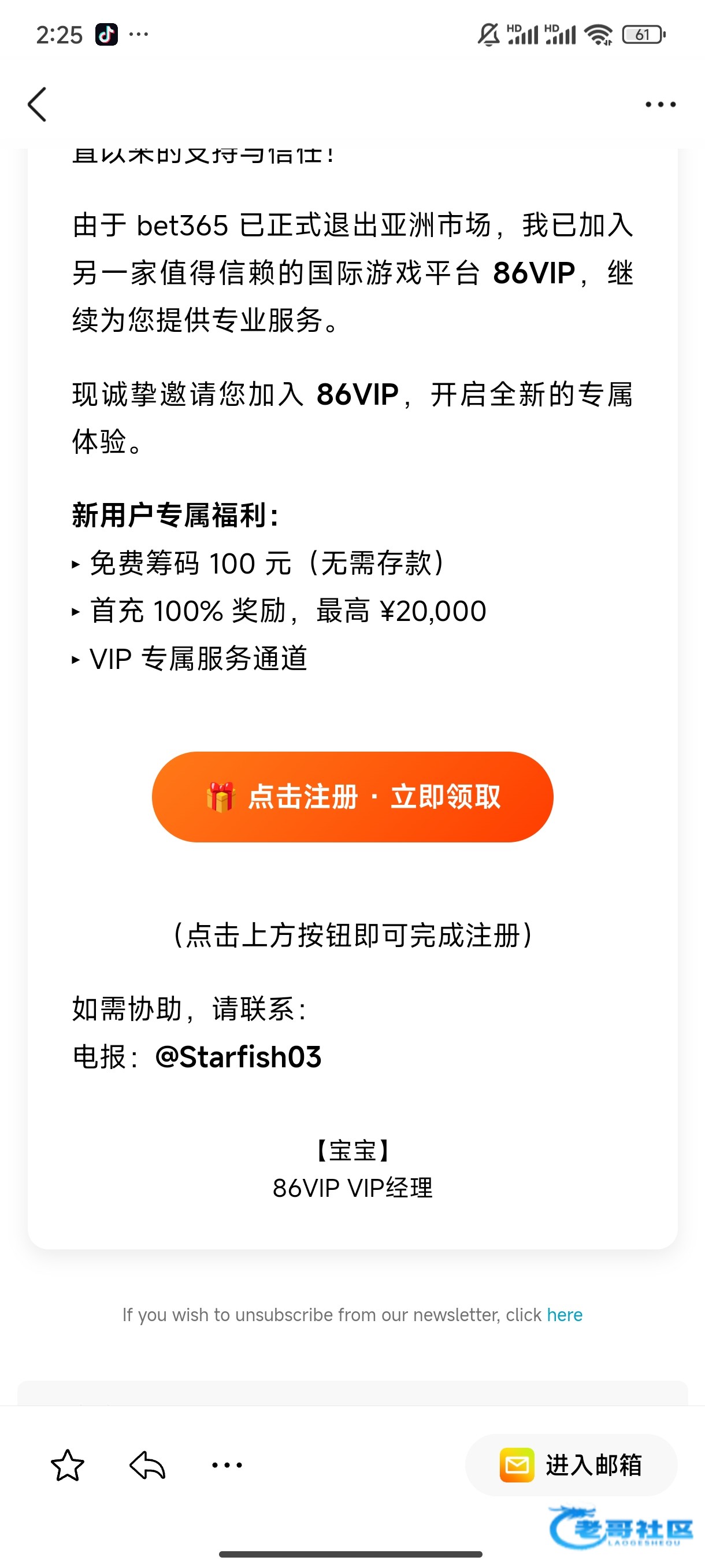 收到的邮箱,注册送了100,不可以打鱼,20倍流水,我没打出来,各位可以看看邮箱,不知道可不可以碰瓷 86vip注册送100,https://m1f59.r.a.d.sendibm1.com/mk/cl/f/sh/7nVU1aA2nfsTSQu9fsEnTXVI6D6fRqr/NnO8EoVI_MBj