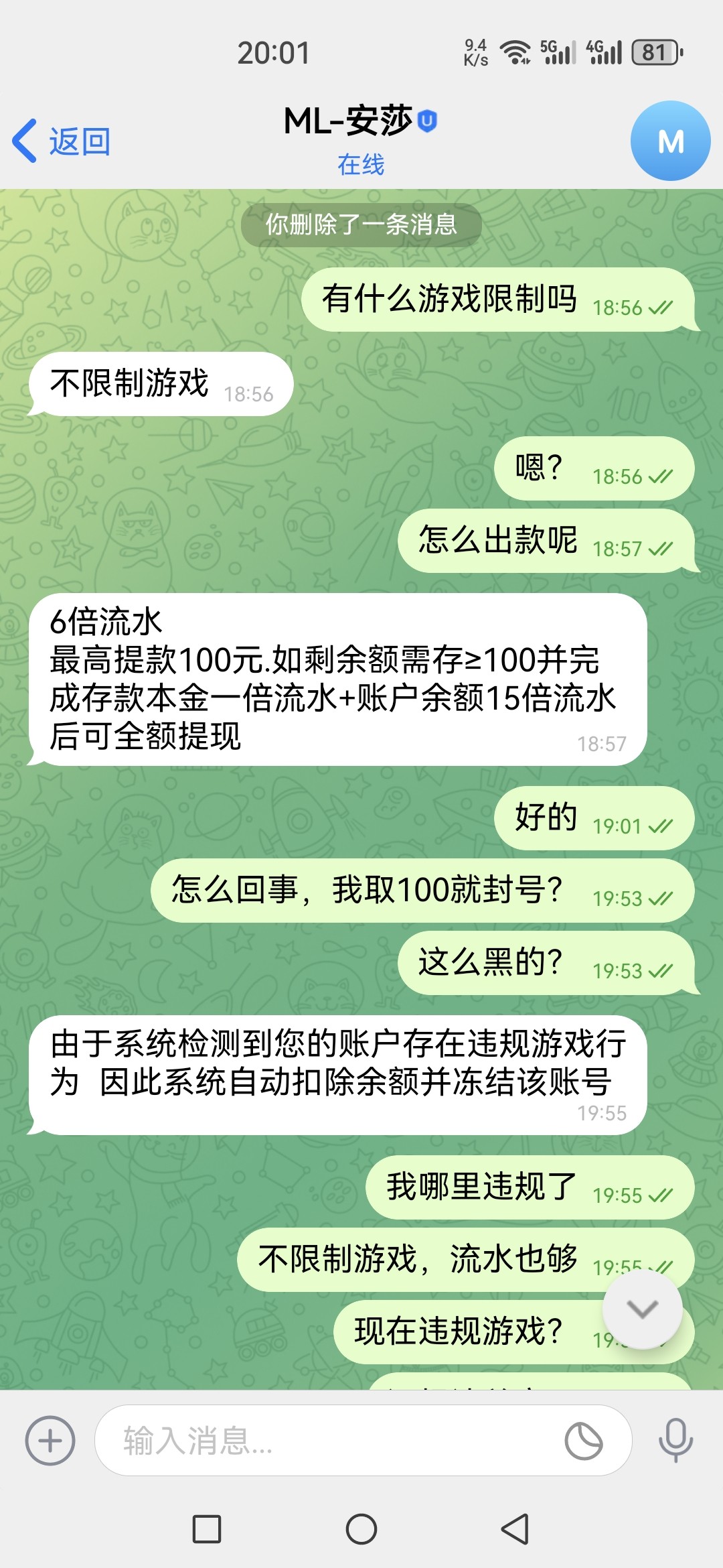 米兰下QT找专员领了58电话彩金,打到1200只提100直接封号,不限制游戏,还说我违规游戏!