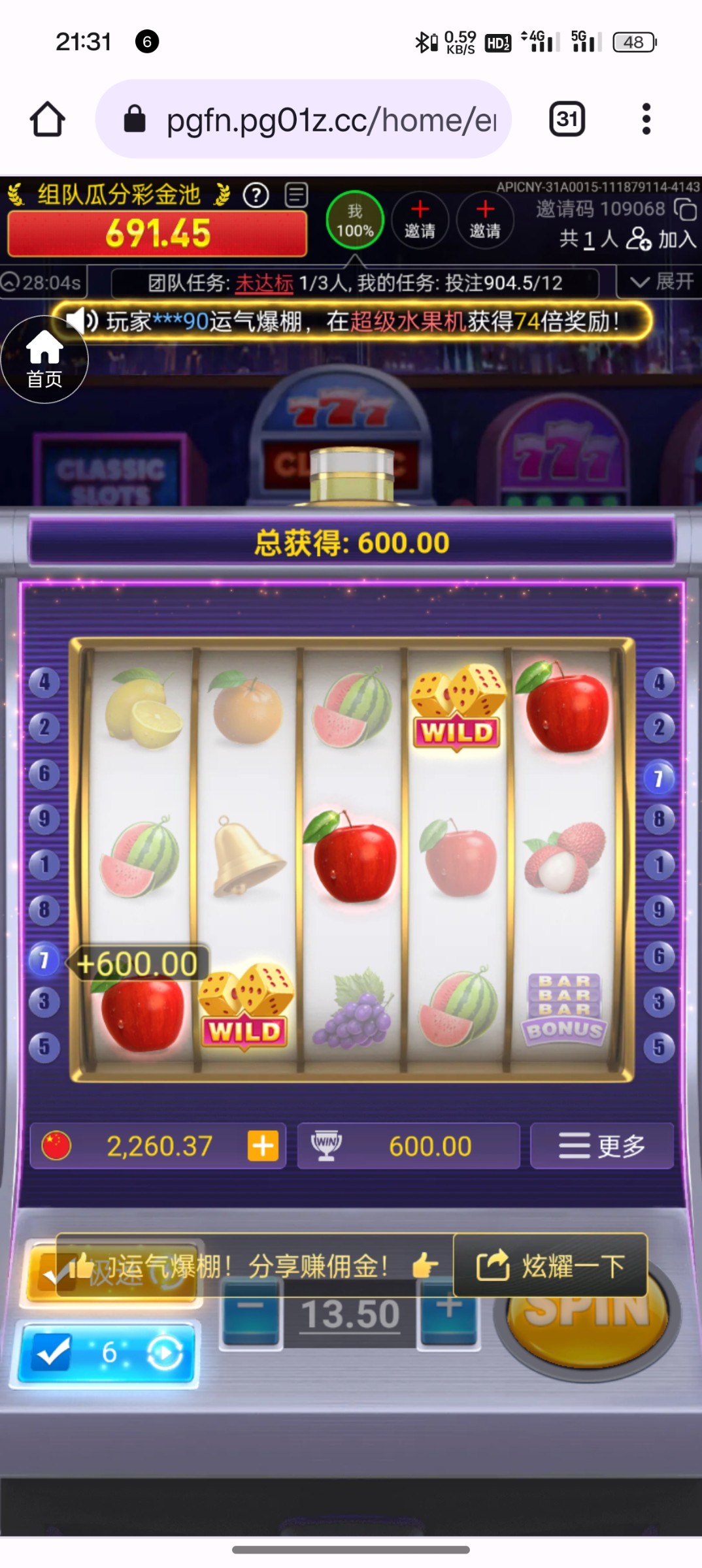 曹他妈的 水真大 刚开始打到100 说满188才能提 后来只让我玩wg电子或者捕鱼 投注满1000才给提 结国果打出来2000多 剩三百 不知道给不给 我都乱玩 结果水太大了