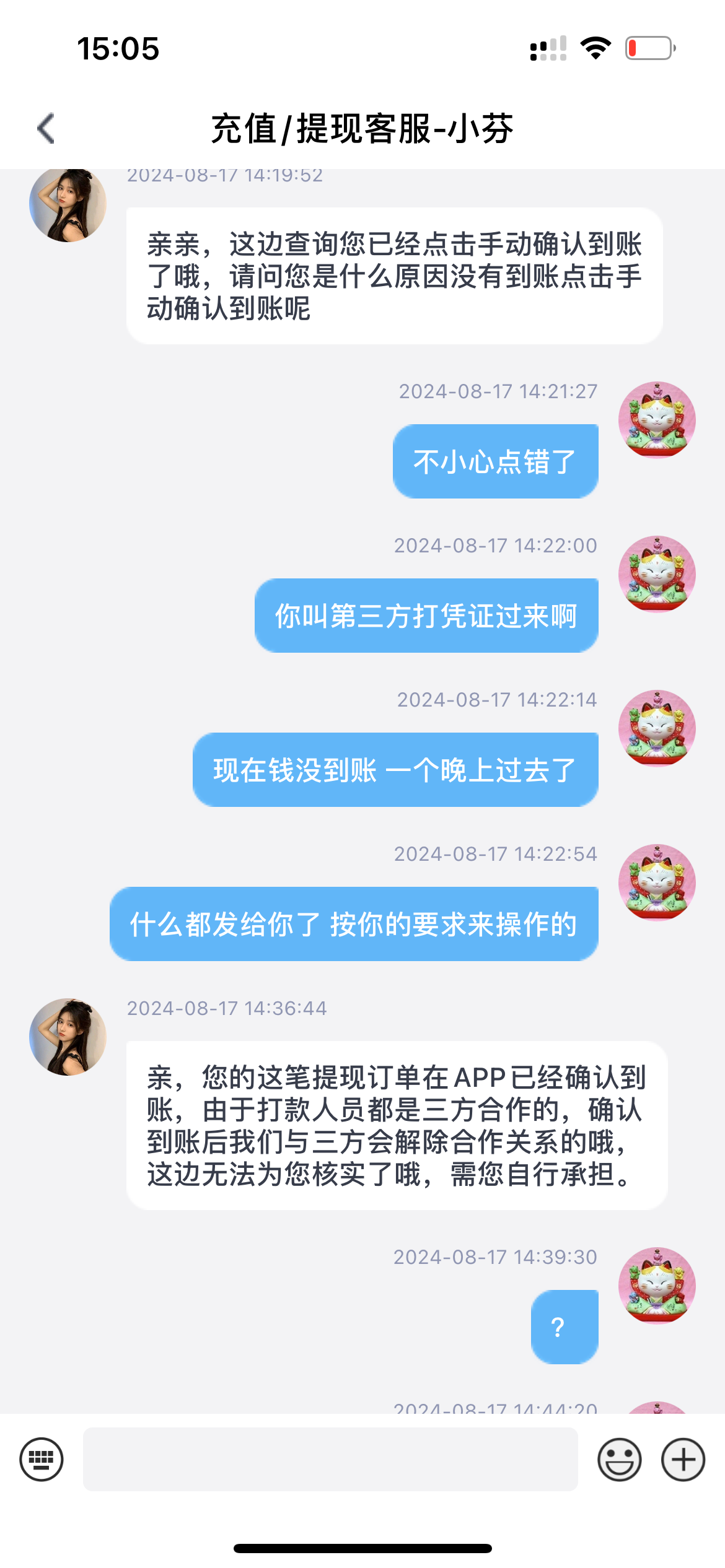 提现的时候显示有个确认到账的按钮 我不小心按着了 就算我不按它系统倒计时也会自动确认。昨晚50上1000是不是给不起啊 1000块都这样搞,假如说他真的打钱过来的话我按不按这个确认到账又有什么影响呢?现在说要自行承担
