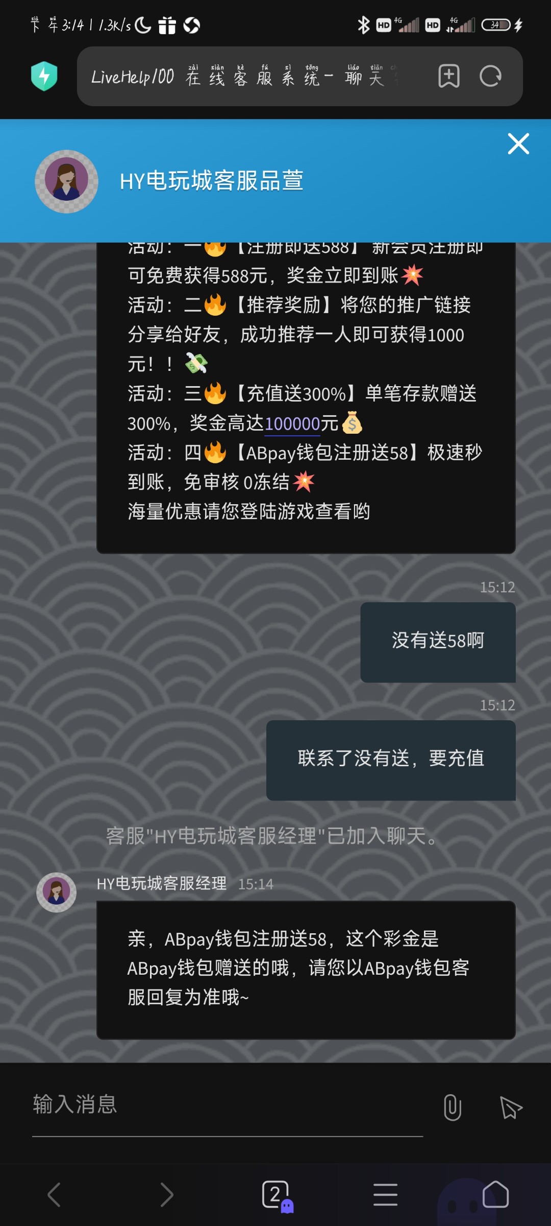 要用hy客服给的链接去注册Ab,Ab客服才会给你送这会人少可以领人多了就要充值了