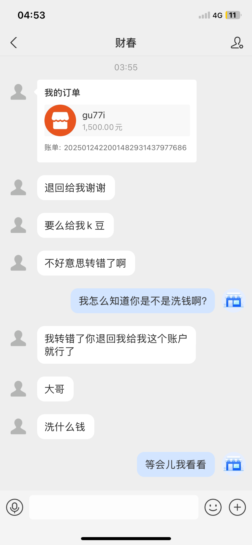 兄弟们跟你们说一个有意思的事情今天我不是卖七百多的K豆吗?然后有一个人把我的K豆买了之后,他又找别人买1500的K豆,结果不小心又把钱转给我了 看看大家怎么