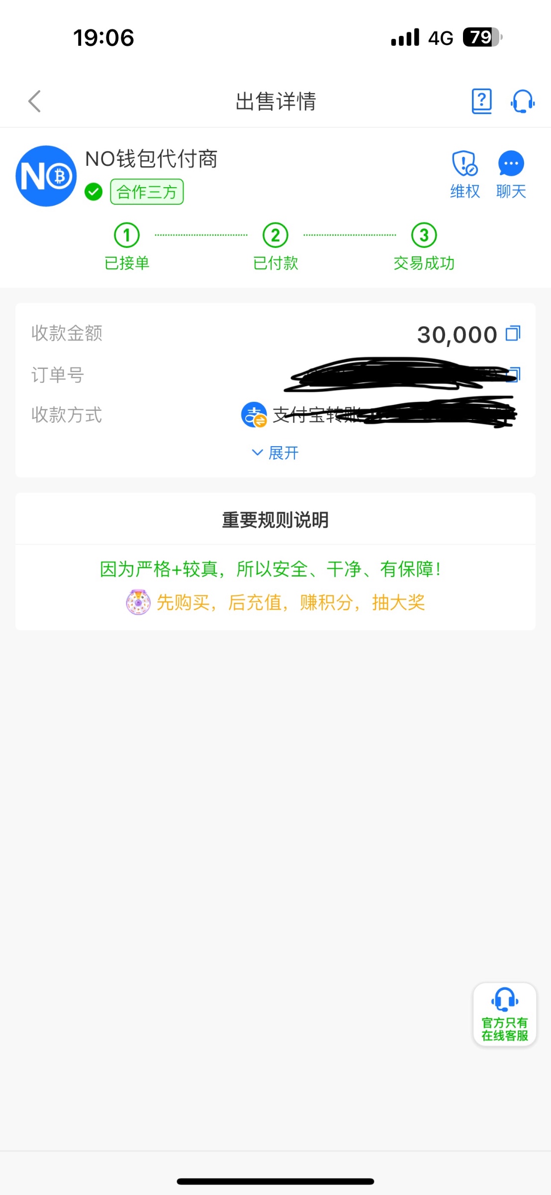 事情是这样的,我提现五个到NO钱包,开始断断续续卖了小一万,然后剩余卖币卖了三天,第三天的时候突然弹出NO钱包第三方合作商接单了,然后支付宝慢慢就有人转钱,钱就到账了,到账后还是自动放币的,有点迷之操作,三方合作商估计是狗庄吧,就是有点担心资金问题,问NO钱包客服说不会有资金问题,似乎有点高级了...