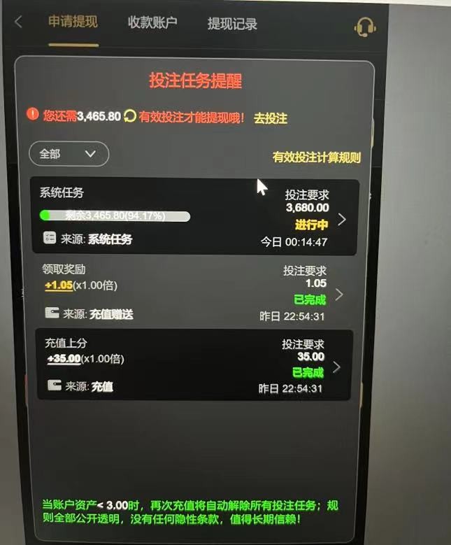 事情是这样的,手机收到这个黑台短信以为有特邀,就注册了账号,然后上论坛搜索了一番,论坛没有这台子任何正面和负面消息,看到充35就送10快,就充值35上去了,也没领狗台的任何优惠,包括这10块,一路35块打pg到700 于是下分,狗台不给出,说注单异常要打3600多流水,并且只能玩棋牌和捕鱼,于是这700多打ag捕鱼进10倍场打到3600多,再次下分狗台没有理由了,直接封了对话ip,我总结一下客服问了一句你下多少?估计我30下3600狗台给不起,下700也给不起就是一个黑台,大家注意必坑
