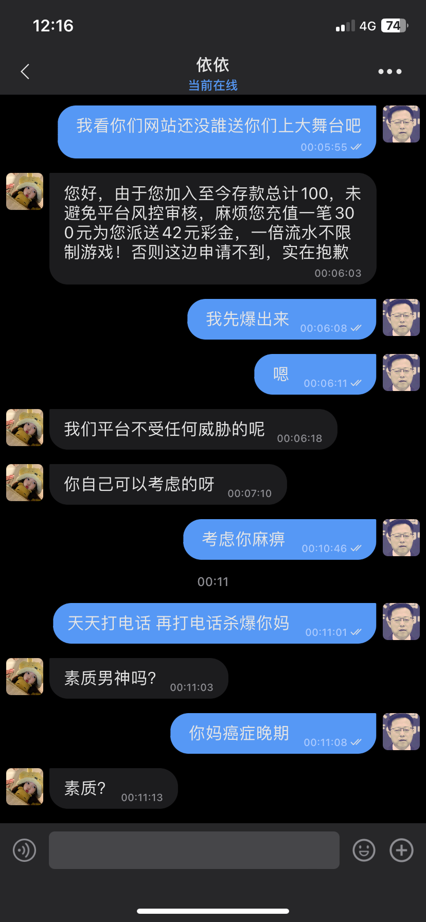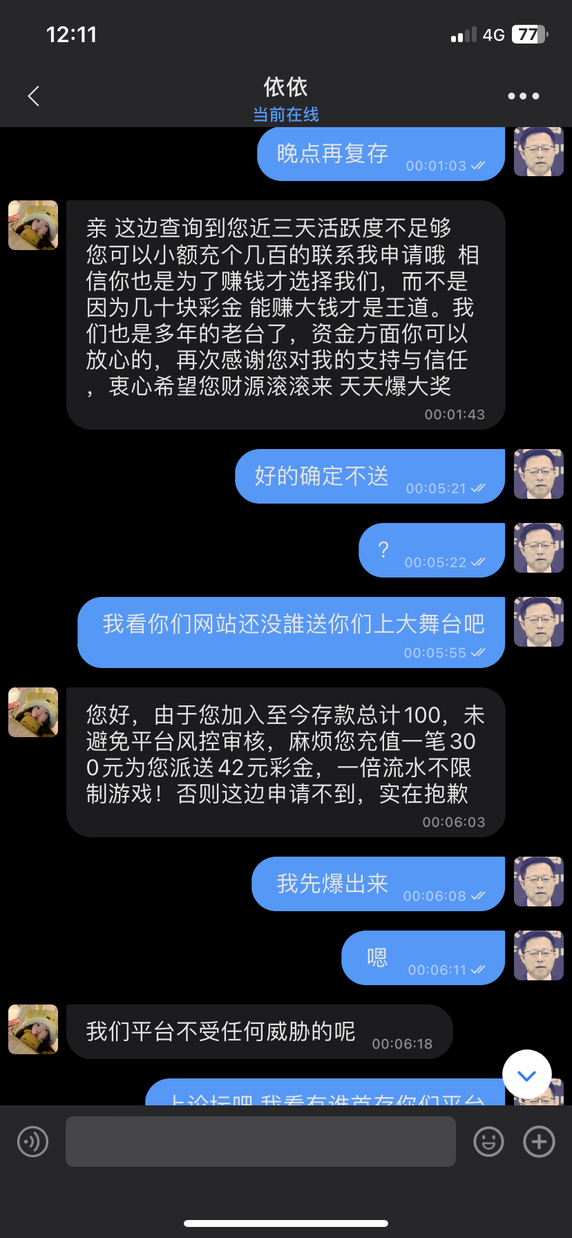 老哥们避雷套路平台 天天打电话 跟澳彩一个德行 但是比澳彩还没下限 88 分三天送 第三天42 还不送了 里面电子更是杀的一逼 100 就打110的流水
