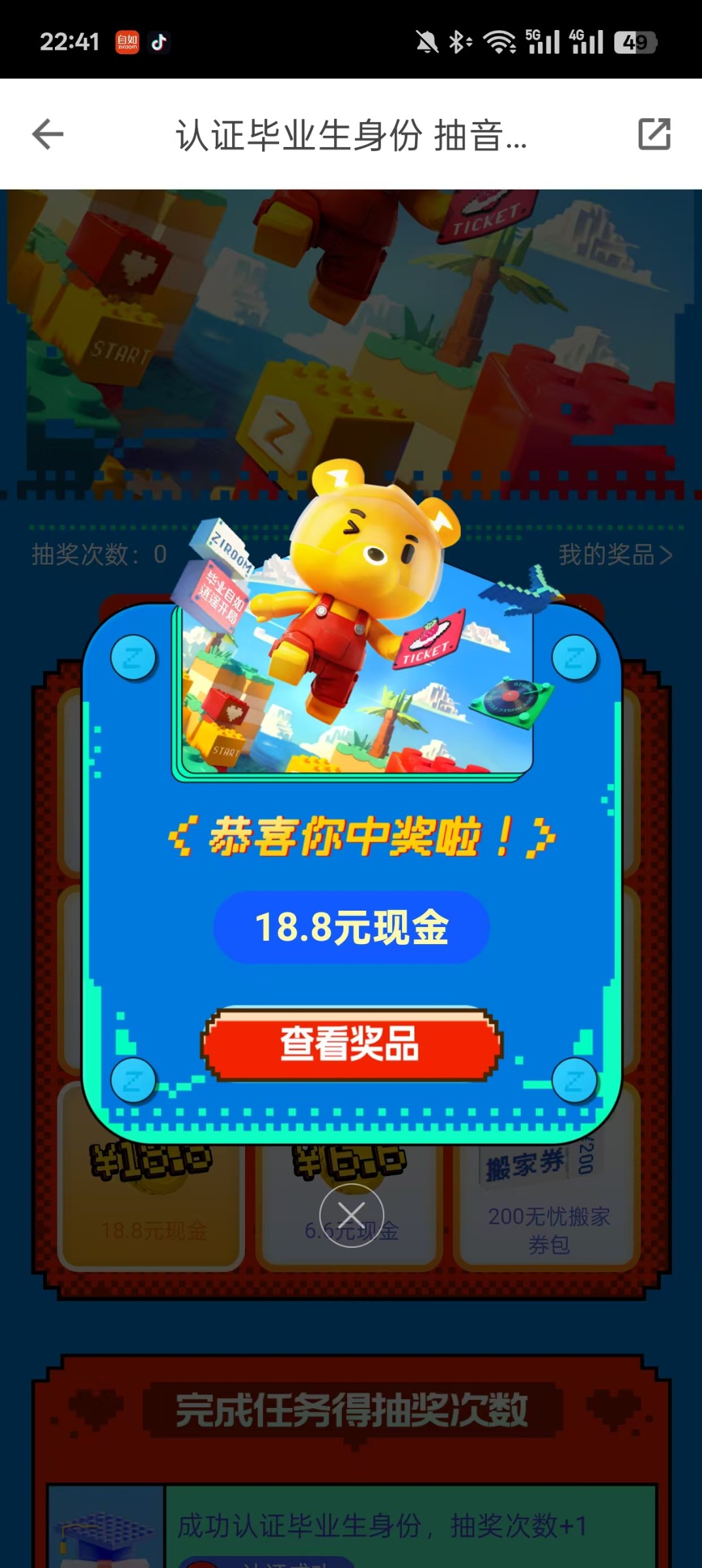 如图下载自如APP横幅认证毕业生抽门票,去认证学信网,必须是23-25年毕业的,然后抽奖,脸白抽中18.8,然后去实名认证,钱包那里到账了就可以提款到银行卡