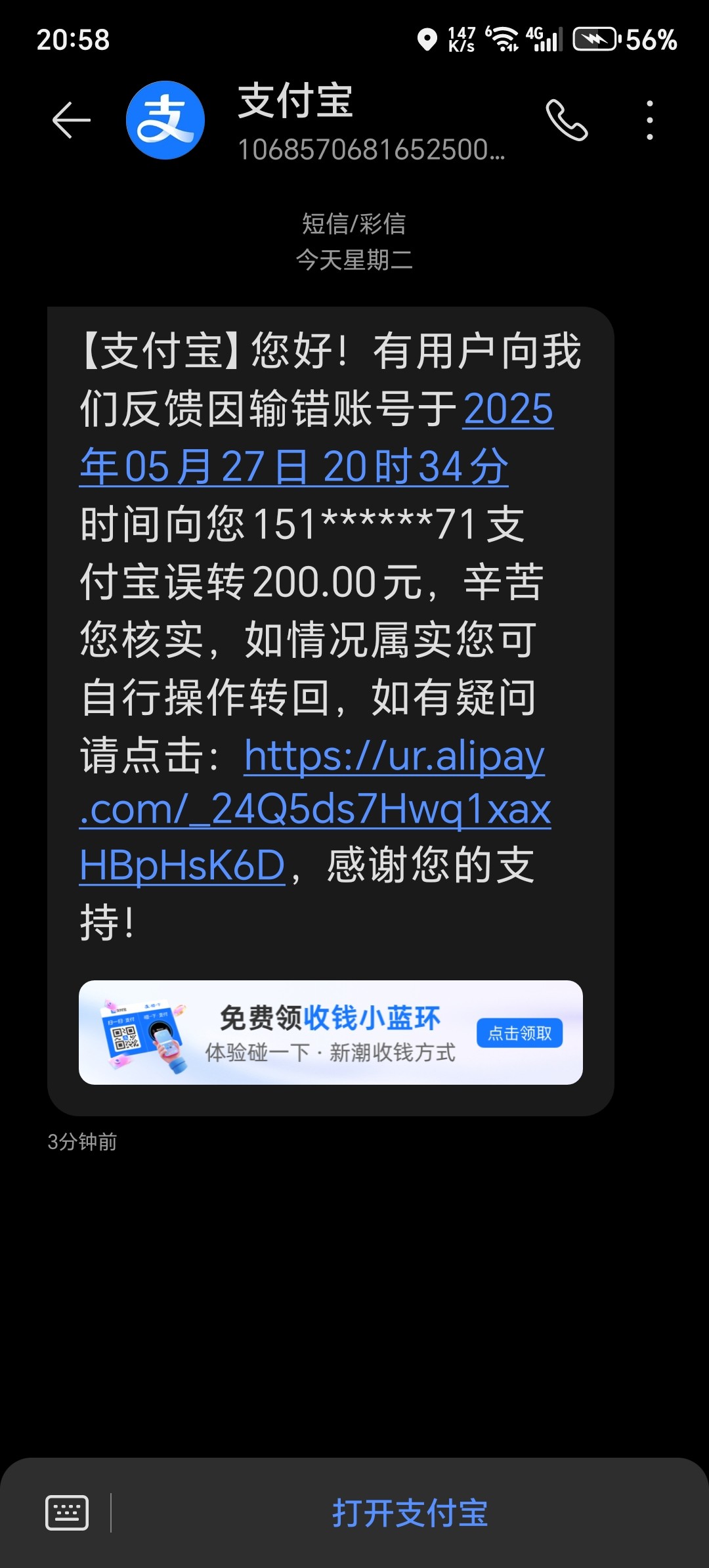兄弟们我支付宝下分收到两百过了一会挂逼仔找客服说误转这种要不要搭理他