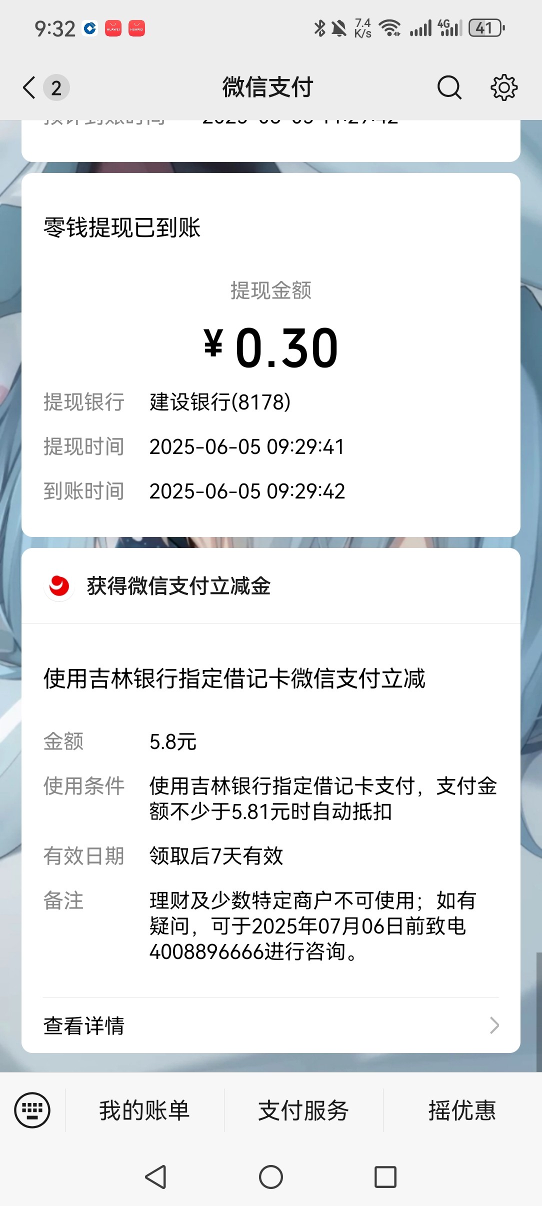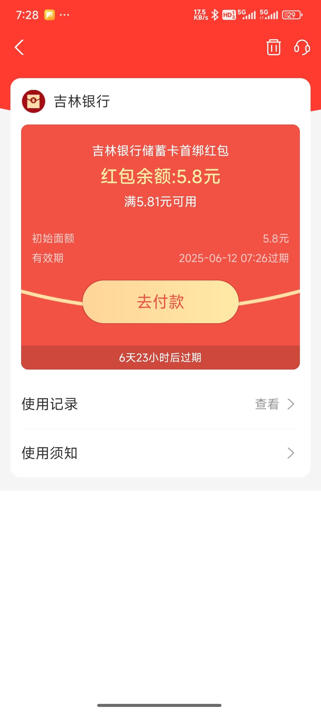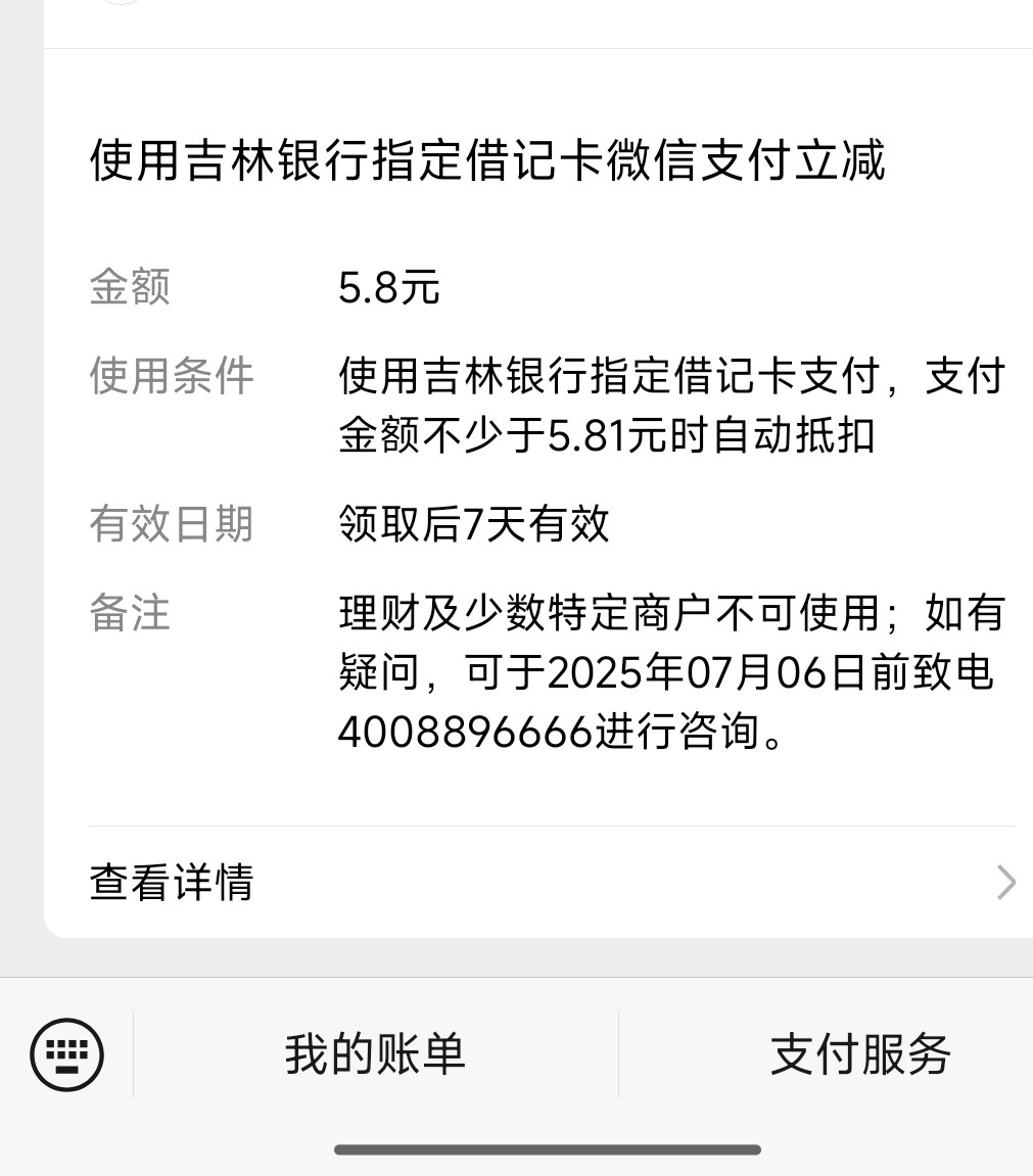 从微信查看卡号,绑定到支付宝上。但是支付宝没给立减金微信倒是给了5.8立减金