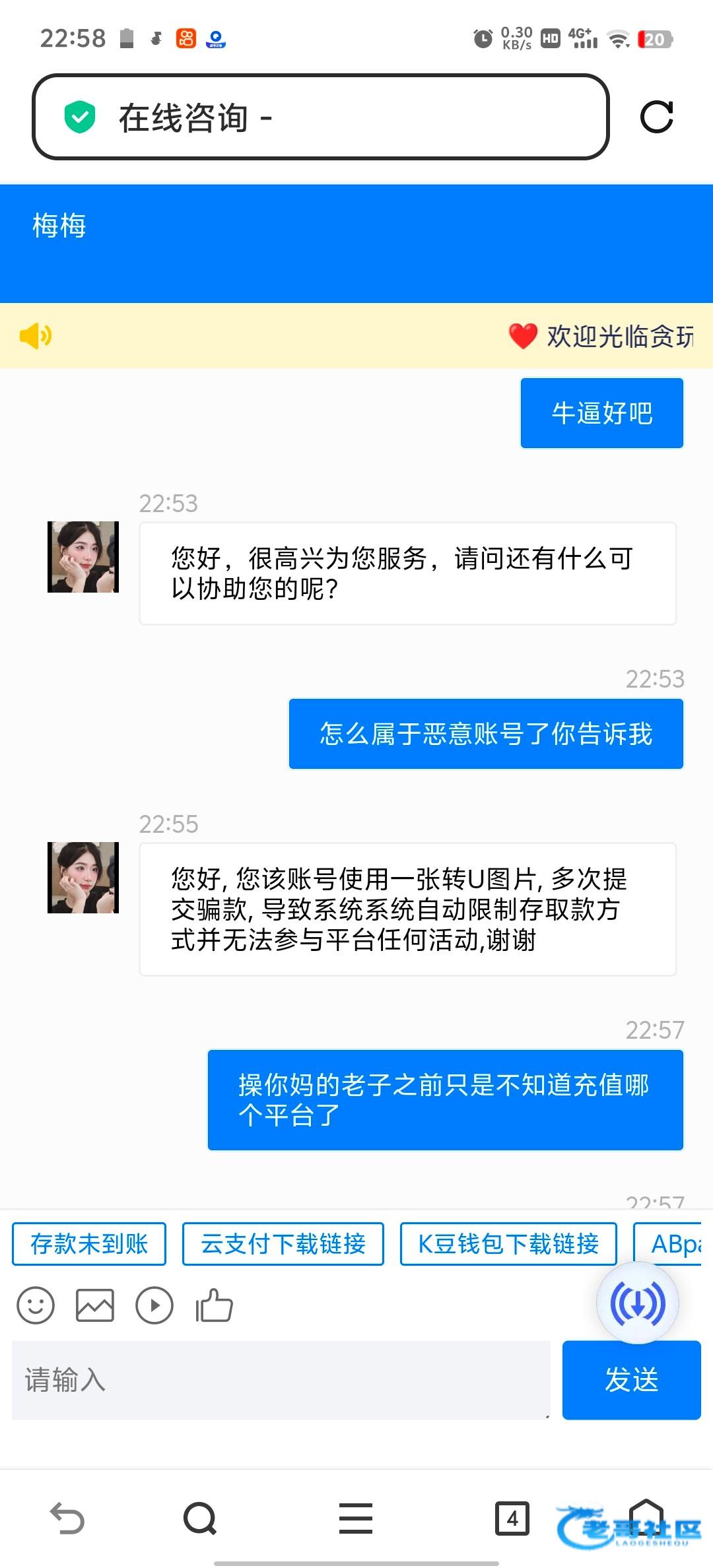 煞笔贪玩注意点都别玩了之前充值这种系列的转u充值了然后贪玩的也充值贪玩的u地址没有复制到转到别的平台了,现在给我说把我拉黑了还是我用u多次骗单