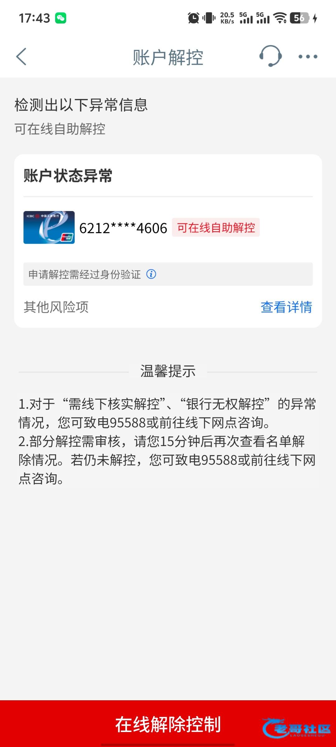 老哥们是银行冻结的不是反诈我自己的支付宝提现到银行卡的能解开吗兄弟们可以在线解控我申请会不会过