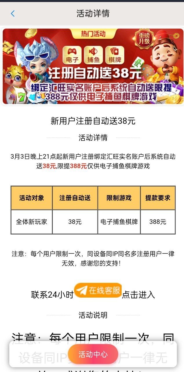 注册绑定汇旺钱包(需要实名一致)找飞机客服申请38彩金。 限制游戏自行查看,打到388出款。建议换国外IP去申请