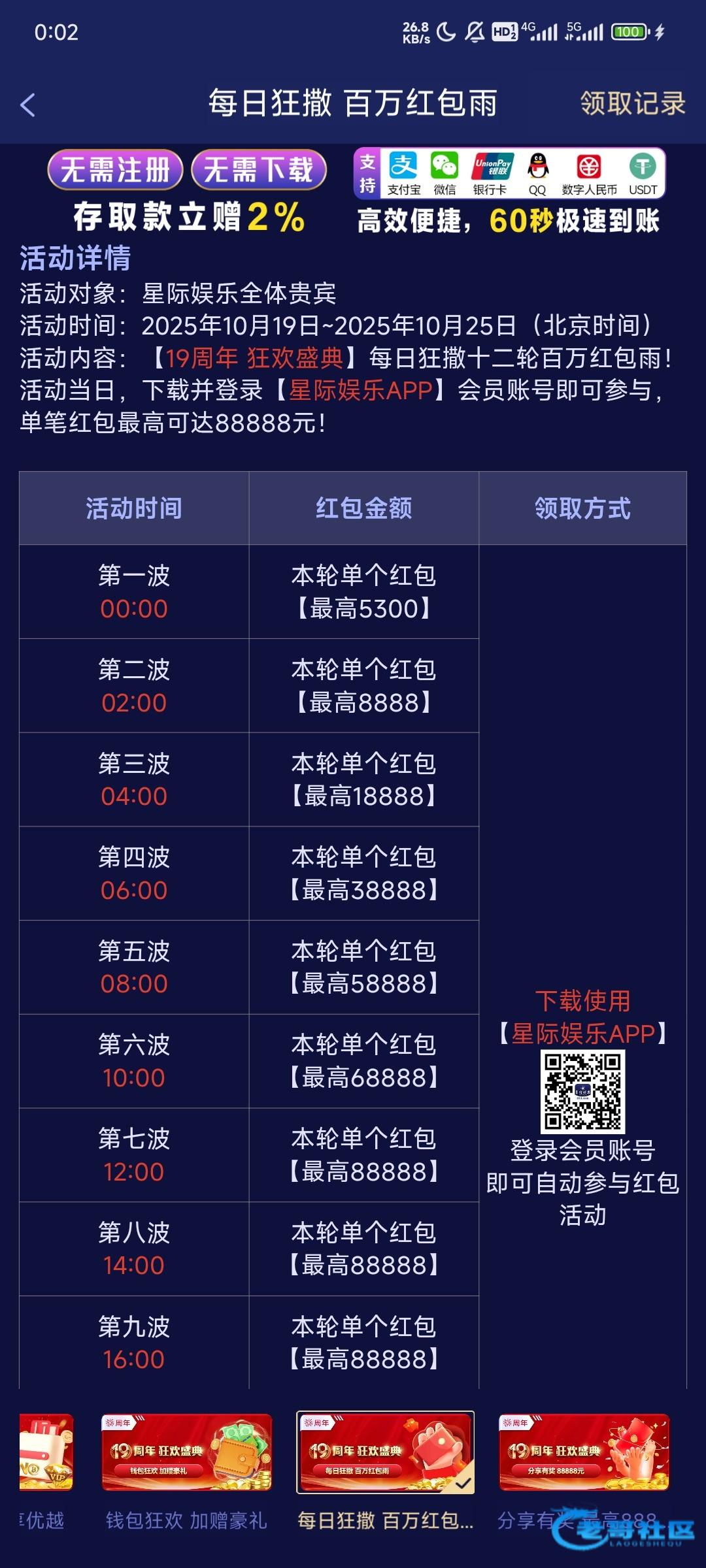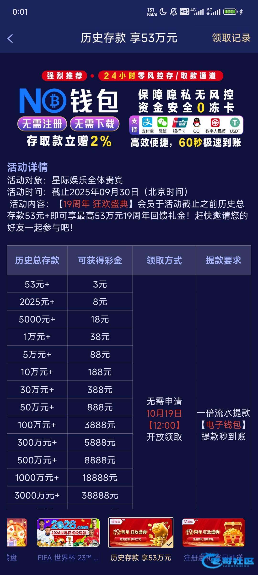 053星际娱乐有周年历史存款彩金,中午12点后去领,有等级的去看看,每两小时还能抢一次红包 053.com