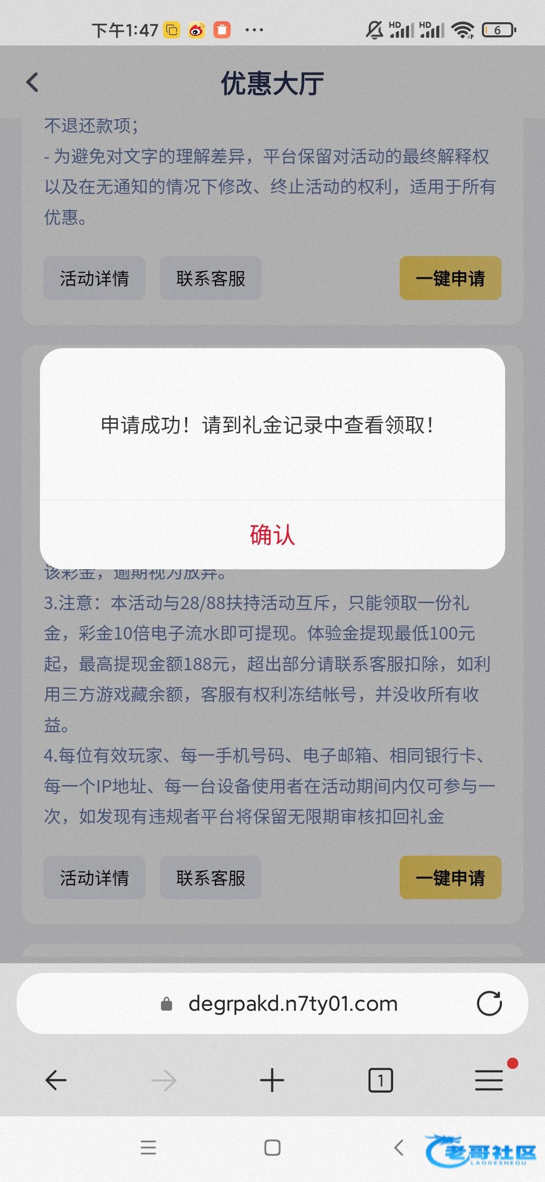 绑定手机号银行卡后去优惠大厅一键申请,我申请没到20秒就到了,因为限制电子游戏 没打出来 不知黑不黑,【白嫖就好了】!!!切勿充!官网:n7ty.com