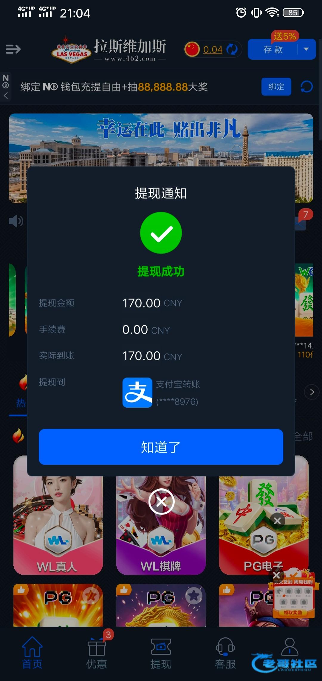 链接462.com 接到电话说免费送彩金 本来就不抱希望因为太无聊了打算消遣一下 ,领了30块 直接拉we麻1 0.6拉进了两次上到140 流水不够 想着当欢乐豆换1.8拉进了一次因为没充值第一次就绑定的支付宝 想换钱包提需要充值 我没充值尝试支付宝提现 两分钟居然到了 得吃170,短信验证的大家可以去试试!没有的请勿内射 老哥们口下留情